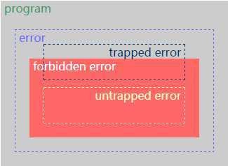 - untrapped errors:程序出错后继续执行(其实并不一定保证继续执行,程序本身并不知道出错,也没有对应的错误处理机制),如 C 语言里的缓冲区溢出,Jmp 到错误地址