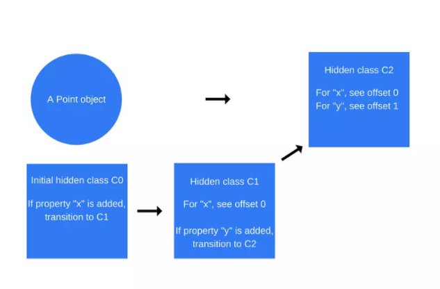 我们知道,像 Java / C++ 这样的静态类型语言对于对象一般都会有个类模板(一般调用函数的时候都是去类模板找的)。而像 V8 这种则是会在运行时创建类模板,从而在访问属性或调用方法的时候仅需要计算该属性在类模板中的偏移就可以了;传统的 JavaScript 对象一般是通过 Hash 或 Trie 树实现的,但是查找的效率很低。拿一段代码举例: